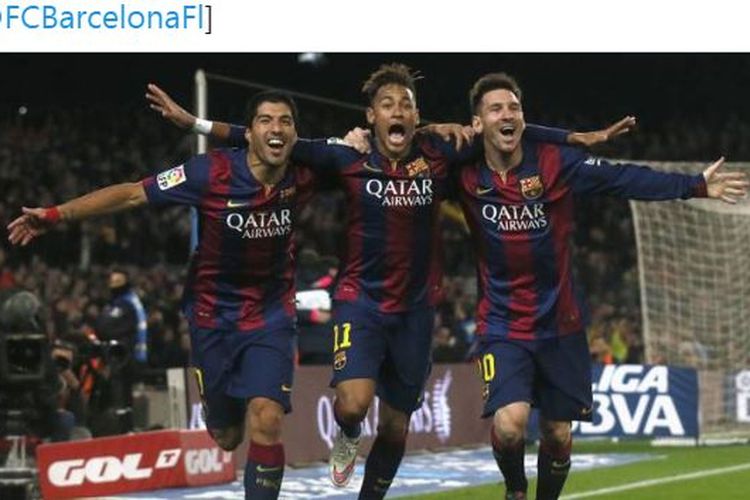 Luis Suarez, Neymar, dan Lionel Messi melakukan selebrasi saat sama-sama berseragam Barcelona. (TWITTER.COM/BARCAUNIVERSAL)