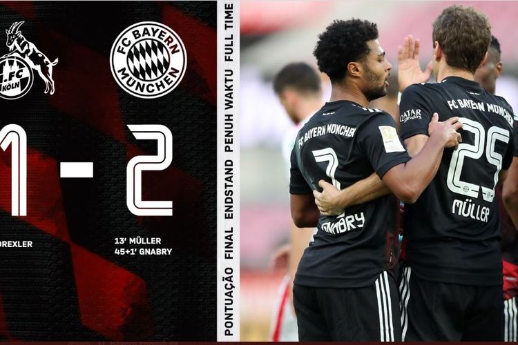 Gol penalti Thomas Mueller dan lesakan Serge Gnabry di babak pertama hanya dibayar Koeln dengan torehan Dominick Drexler menjelang akhir pertandingan.
