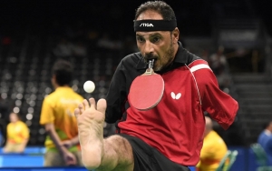 Ibrahim Hamadtou (48) mencuri perhatian dengan gaya permainannya yang tak biasa. Pasalnya sang atlet para-tenis meja menggigit bat serta melakukan service dengan kakinya.
