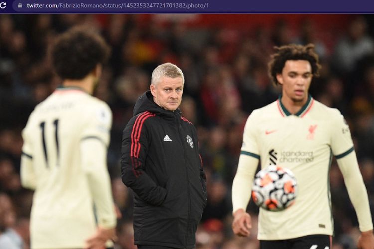 Pelatih Manchester United, Ole Gunnar Solskjaer, dalam laga pekan ke-9 Liga Inggris 2021-2022 melawan Liverpool di Old Trafford pada Minggu (24/10/2021). (TWITTER.COM/FABRIZIOROMANO)