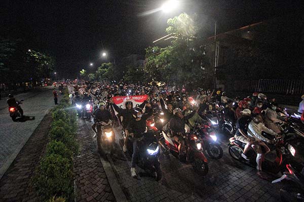 Ribuan suporter konvoi sepeda motor Selasa (28/12/2021) dini hari merayakan kemenangan Persis Solo setelah mengalahkan Martapura Dewa United pada babak semifinal. (Solopos/Nicolous Irawan)