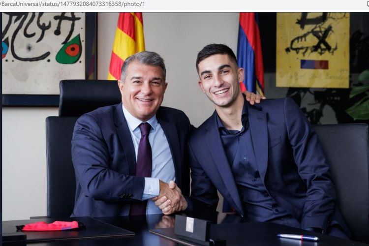 Ferran Torres berpose dengan presiden Barcelona, Joan Laporta. (TWITTER.COM/BARCAUNIVERSAL)