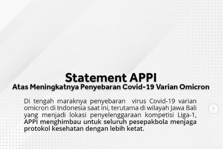 "Terkait meningkatnya penyebaran dan kasus positif Covid-19 varian Omicron, berikut adalah pernyataan resmi dari kami, Asosiasi Pesepakbola Profesional Indonesia,"
