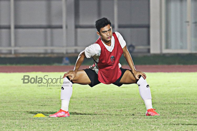 Pratama Arhan nampak sedang melakukan pemanasan dalam latihan timnas Indonesia di Stadion Madya, Senayan, Jakarta, 11 Mei 2021. (MUHAMMAD ALIF AZIZ MARDIANSYAH/BOLASPORT.COM)