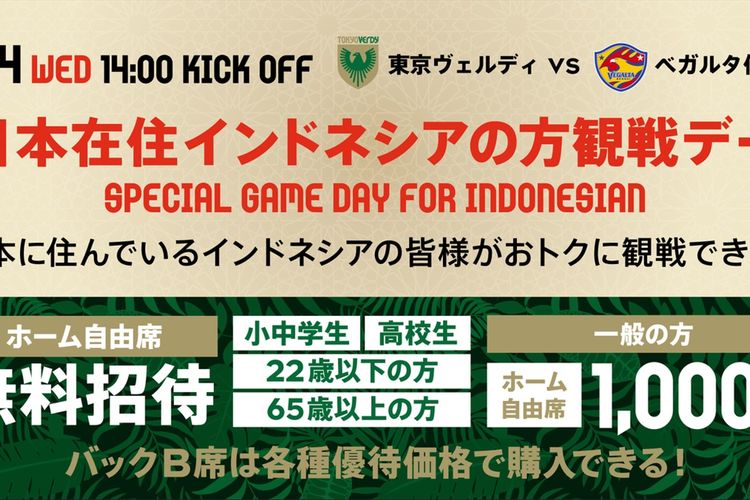 Sementara itu, Tokyo Verdy mengundang warga Indonesia yang berada di Jepang untuk hadir dalam laga melawan Vegalta Sendai.