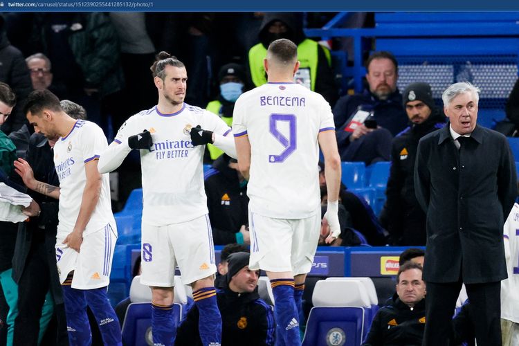 Momen Gareth Bale masuk menggantikan Karim Benzema pada laga Real Madrid kontra Chelsea di leg pertama perempat final Liga Champions 2021-2022. (TWITTER.COM/CARRUSEL)