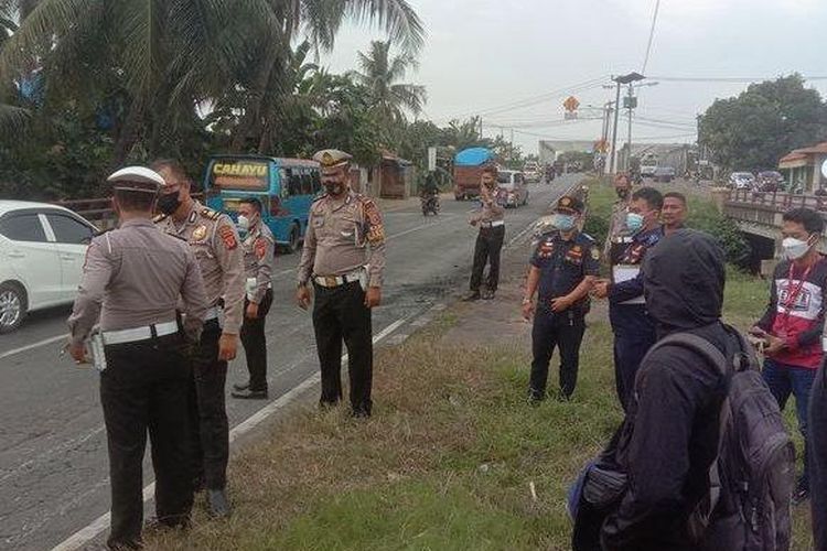 Petugas polisi lakukan olah tempat kejadian untuk mengidentifikasi penyebab kecelakaan suporter Timnas di Jalur Pantura, Senin (11/7/2022). (Tribun Jabar/Ahya Nurdin)