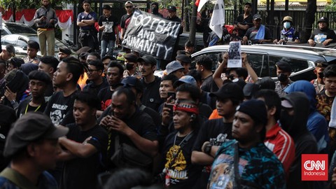 Korban Tragedi Kanjuruhan bersama sejumlah Aremania melakukan aksi damai di Gedung Mabes Polri, Trunjoyo, Jakarta, pada Sabtu 19 November 2022. (CNN Indonesia/Adhi Wicaksono)
