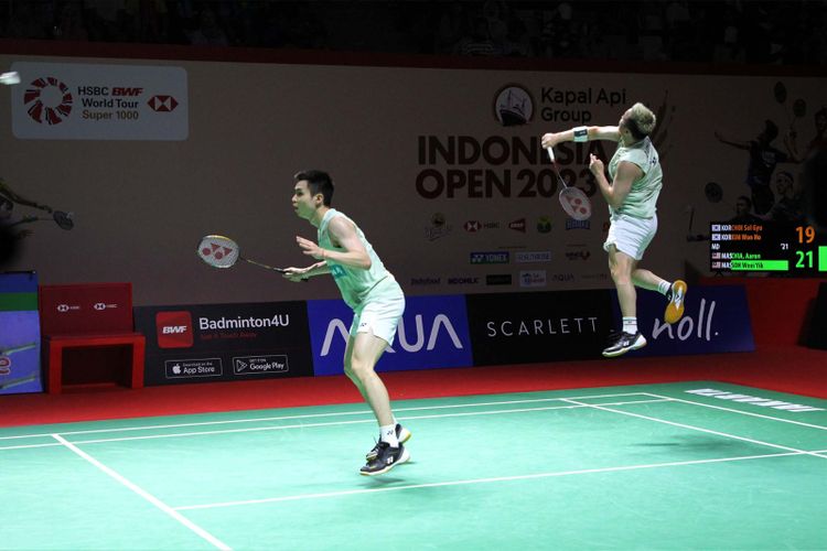Pasangan ganda putra Malaysia, Aaron Chia/Soh Wooi Yik, saat tampil pada babak kedua Indonesia Open 2023 di Istora Senayan, Jakarta, Kamis, 15 Juni 2023 (TOMMY NICOLAS/BOLASPORT.COM)