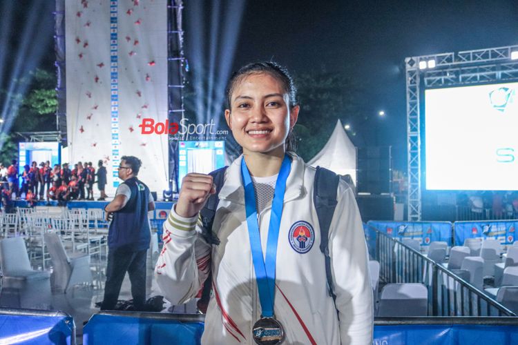 Atlet panjat tebing putri Indonesia, Desak Made Rita Kusuma Dewi, sedangberpose setelah laga Piala Dunia Panjat Tebing 2023 ( IFSC World Cup) di Lot 6 Gelora Bung Karno, Senayan, Jakarta, Minggu (7/5/2023) malam. (MUHAMMAD ALIF AZIZ MARDIANSYAH/BOLASPORT.COM)