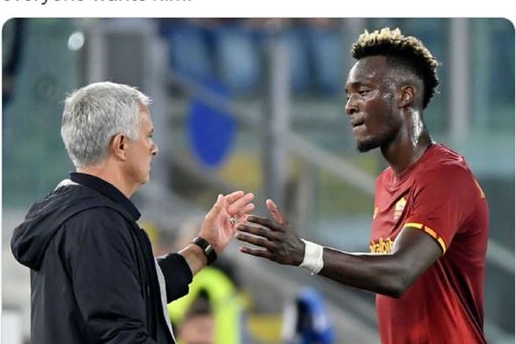 Jose Mourinho dan Tammya Abraham pada sebuah laga bersama AS Roma. (TWITTER.COM/CABINESPORT)
