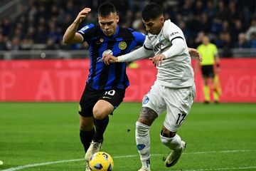 Lautaro Martinez berusaha menjangkau dan menembak bola tetapi bek Napoli, Juan Jesus, berhasil melakukan blok.