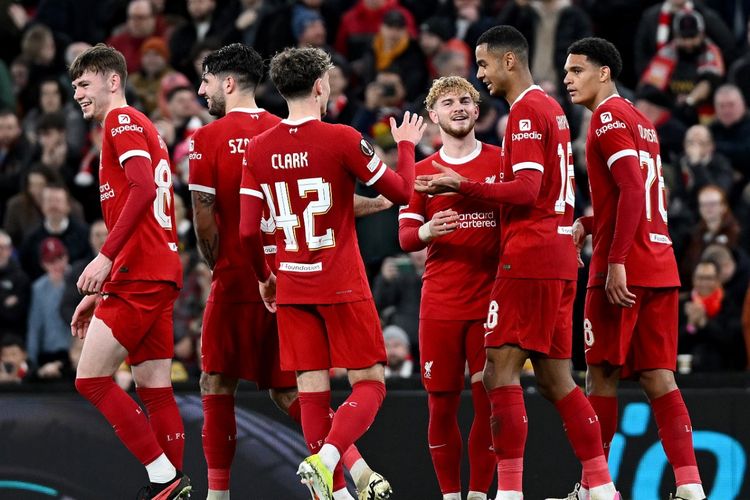 Para pemain Liverpool merayakan gol Cody Gakpo ke gawang Sparta Praha dalam leg 2 babak 16 besar Liga Europa 2023-2024 di Stadion Anfield, Kamis (14/3/2024). (TWITTER.COM/PREMIERLEAGUE)