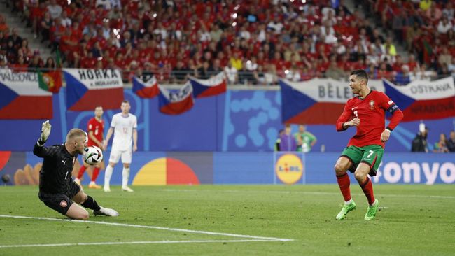 Cristiano Ronaldo tampil di laga Portugal vs Republik Ceko di Euro 2024. CR7 pun resmi jadi manusia pertama yang tampil di enam edisi Euro alias Piala Eropa.