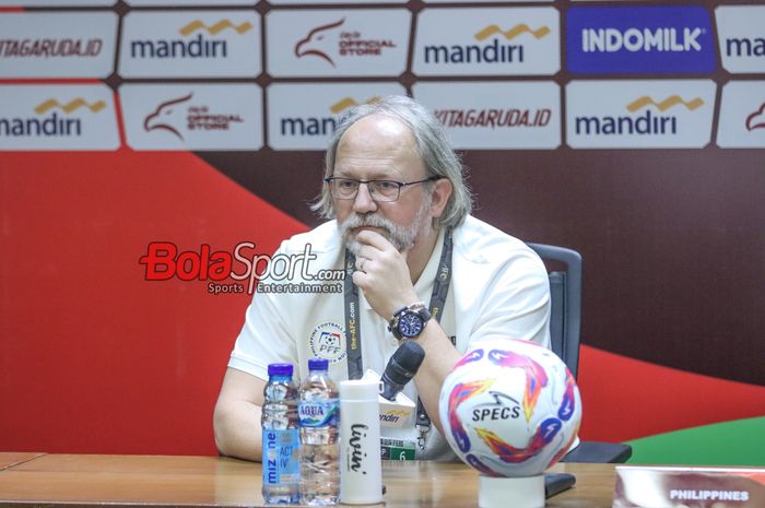 Pelatih timnas Filipina, Tom Saintfiet, saat hadir dalam sesi jumpa pers di Media Center Stadion Utama Gelora Bung Karno, Senayan, Jakarta, Senin (10/6/2024).