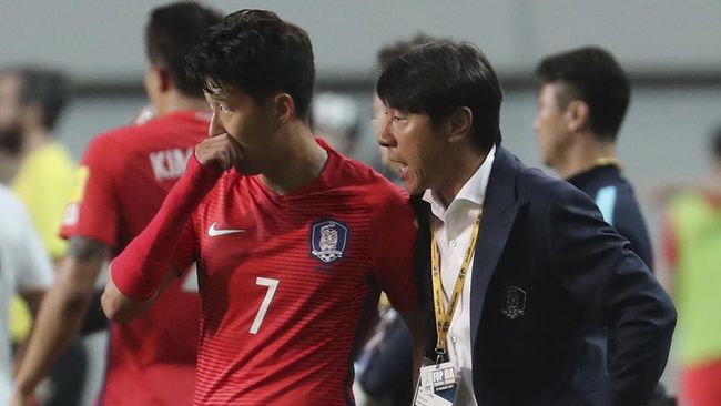 Shin Tae Yong (kanan) saat melatih timnas Korea Selatan yang diperkuat Son Heung Min. (AP/Lee Jin-man)