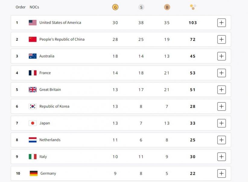 Berikut klasemen 10 besar perolehan medali Olimpiade Paris 2024: