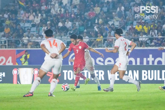 Aksi Marselino Ferdinan saat timnas Indonesia menghadapi Myanmar pada matchday pertama Grup B ASEAN Cup 2024 di Stadion Thuwunna, Myanmar, Senin (9/12/2024). (PSSI.ORG)BOLANAS.COM - Timnas Indonesia menang tipis atas Myanmar pada laga perdana Grup B ASEAN Cup 2024 di Stadion Thuwunna, Myanmar, Senin (9/12/2024).