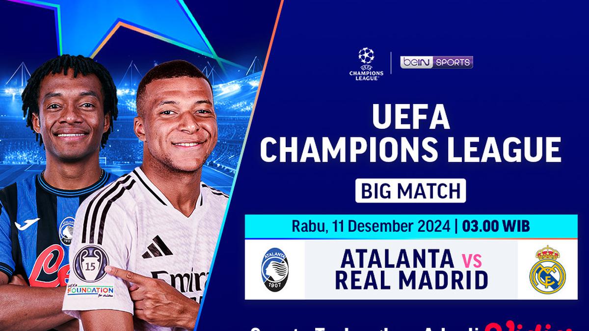 Bola.com, Jakarta Live streaming big match Liga Champions 2024/25 antara Atalanta vs Real Madrid di matchweek ke 6 yang akan berlangsung pada Rabu, 11 Desember 2024. Disiarkan langsung secara eksklusif melalui layanan OTT Vidio.