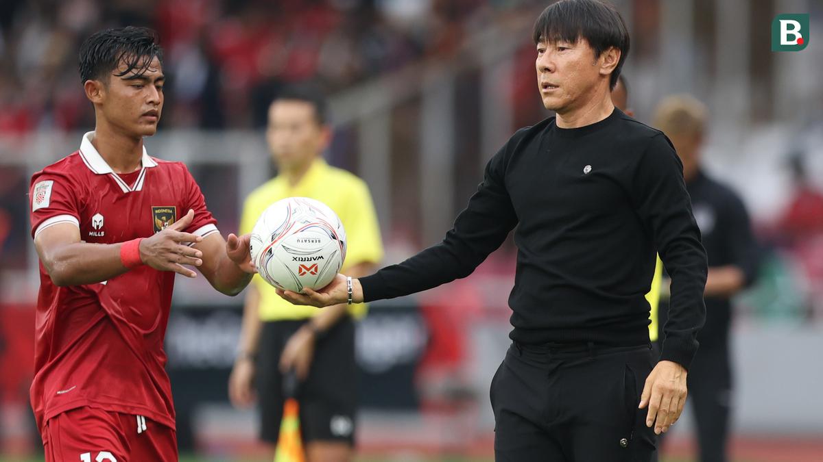 Pelatih Timnas Indonesia, Shin Tae-yong (kanan) memberikan bola kepada pemainnya, Pratama Arhan saat laga Grup A Piala AFF 2022 antara Timnas Indonesia melawan Timnas Kamboja yang berlangsung di Stadion Utama Gelora Bung Karno (SUGBK), Jakarta, Jumat (23/12/2022). (Bola.com/Bagaskara Lazuardi)