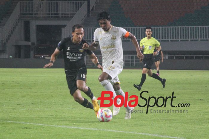 Pemain Arema FC Johan Ahmat Farizi (kanan) sedang menguasai bola di bayangi oleh Pemain Dewa United Egy Maulan (kiri) saat bertanding di Stadion Pekansari, Kab.Bogor, Sabtu (11/01/2025) malam WIB.