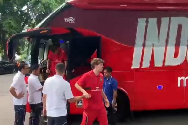 Timnas Indonesia lengkap dengan ofisial datang menaiki bus berwarna merah.