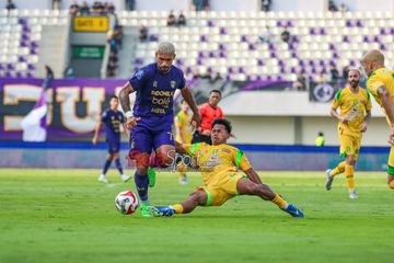 Pemain yang baru menjalani laga perdananya bersama Persita itu masih berusaha mencetak gol, tetapi kesulitan membobol gawang Ernando Ari.