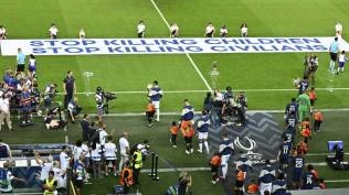 Pejabat Israel tidak terima dengan spanduk resmi UEFA yang menyerukan penghentian anak-anak dan warga sipil tersebut.